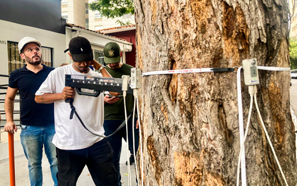 O engenheiro florestal e agrônomo José Hamilton de Aguirre Junior (ao fundo) observa a sibipiruna, enquanto equipe do Comdema realiza a tomografia de impulso sônico e a resistografia, técnicas capazes de diagnosticar a saúde da árvore | Foto: Moara Semeghini/Correio da Manhã